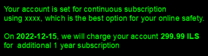 במקרה של תוכנה אחרת, נשלח מייל המודיע שעקב "תוכנית החידוש האוטמטי", חשבון הבנק שלי יחוייב בעוד 14 יום בכך וכך: